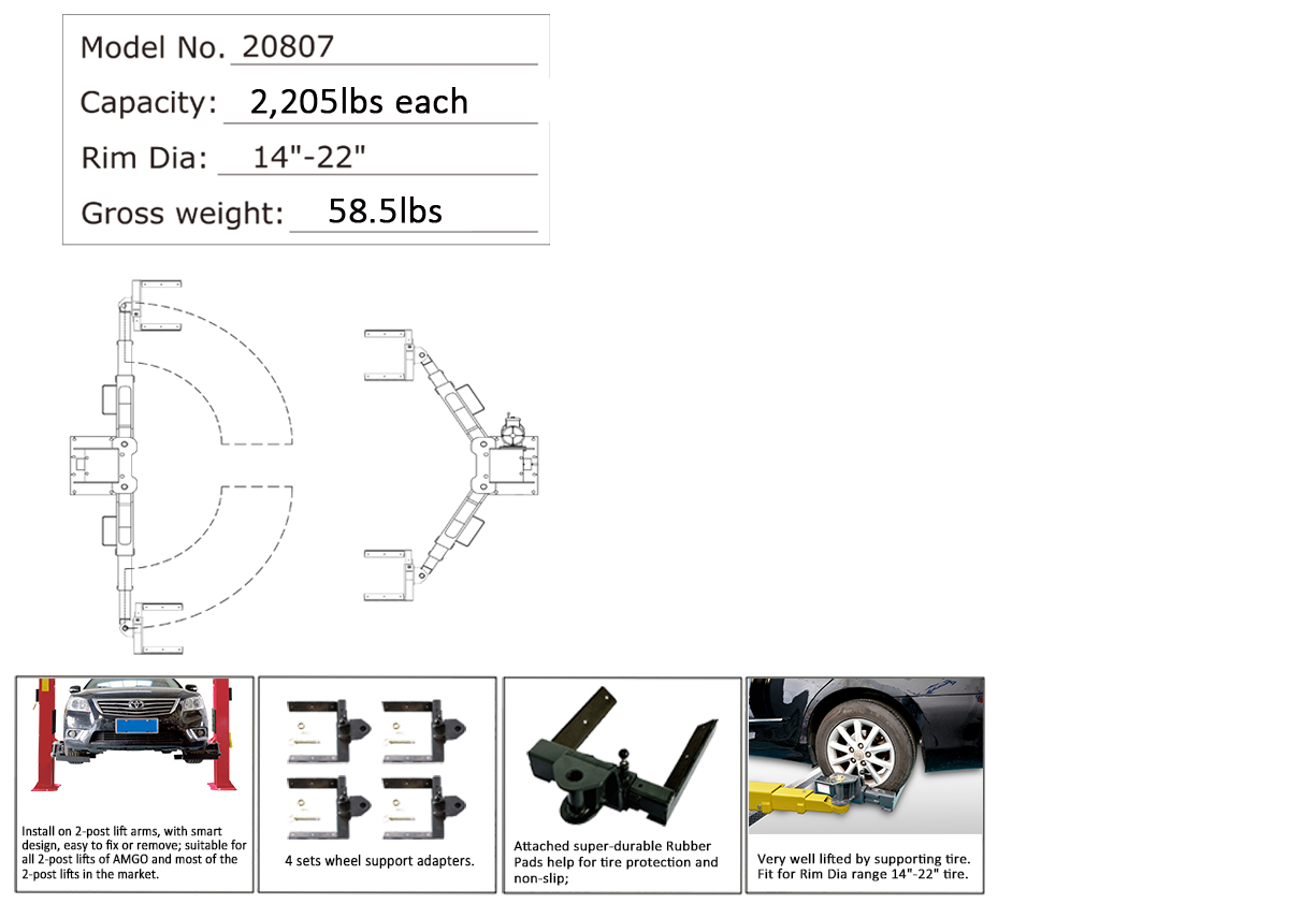- Install on 2-post lift arms, with smart design, easy to fix or remove; suitable for all 2-post lifts of AMGO and most of the 2-post lifts in the market