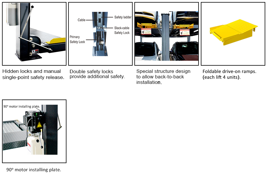 Our newest space saving 9,000lbs lift. 1 lift can accommodate 2 parking positions to park 4 vehicles. It’s low profile, with hidden safety locks and single-point lock release. Foldable drive-on ramps come standard.