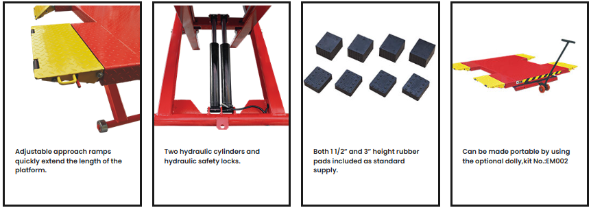 This mid-rise, portable lift is an excellent choice for a low ceiling tire shop or service center that wants to get a passenger car or light SUV lifted as quickly as possible. The EM06 model raises vehicles to a full 40″. Simply drive the vehicle over the approach ramps and place the rubber support blocks under the vehicle’s lifting points.