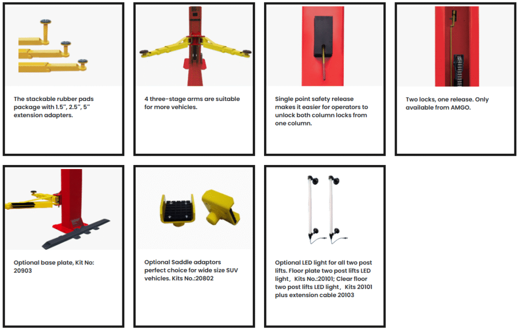 AMGO BP series base plate two column lift are stronger and easier to operate than any other lifter in the world. The rugged BP-10 can lift up to 10,000lbs vehicles. It is designed without overhead barriers and suitable for professional and family garages with low ceilings to increase headroom. AMGO’s two column lifts are manufactured to high quality standards, using critical materials and components, with advanced features and innovative technology.