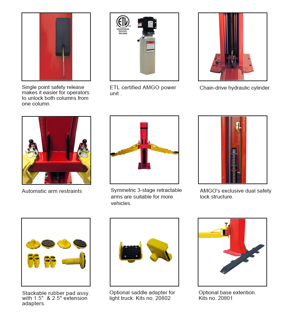 AMGO BP-9 is equipped with a dual safety lock structure and a single-point manual lock release mechanism, ensuring both safe and comfortable operation. The base plate design provides shorter columns to accommodate ceiling height 9ft or higher. Its symmetric 3-stage retractable arms offer large swing ranges to accommodate varying vehicles weighing up to 9000lbs.