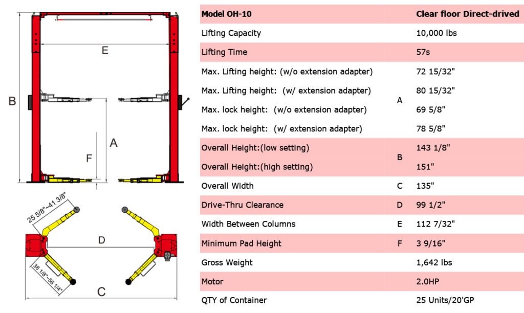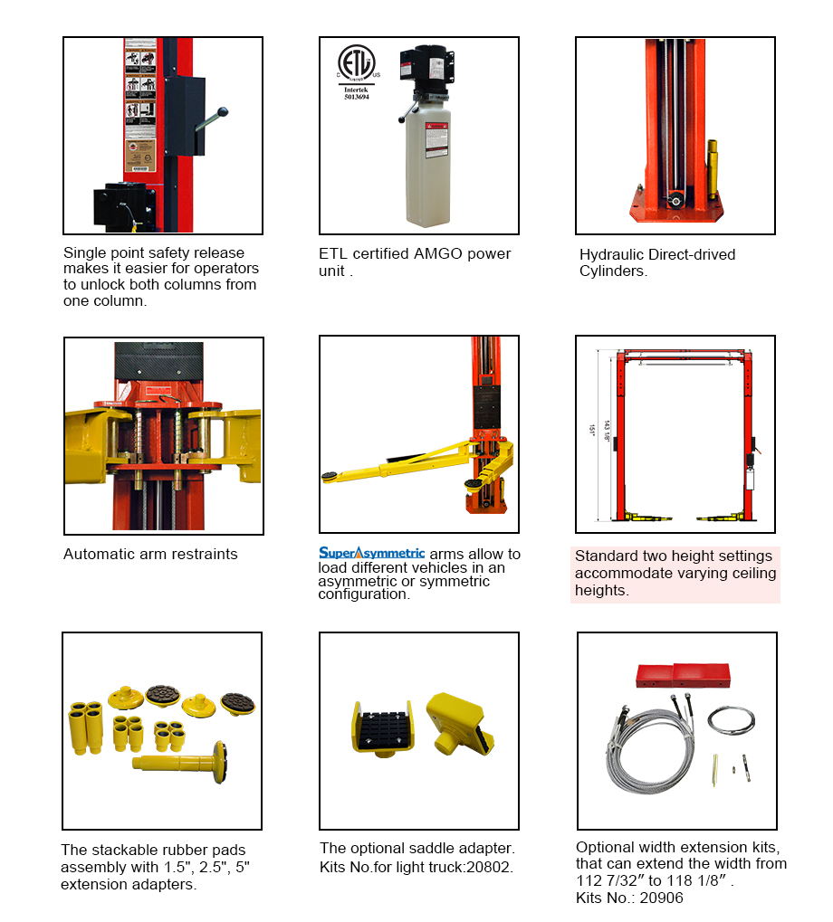 The new OH-10 is an industrial-level two post lift by ALI certified, representing AMGO’s professional expertise in development and manufacture. The robust design features two height setting as standard, and two width setting as optional. It incorporates professional technologies such as Super Asymmetric patent technology and single-point lock release technology, ensuring safety priority, durable longevity and convenient operations.