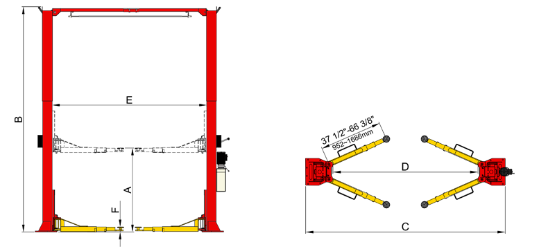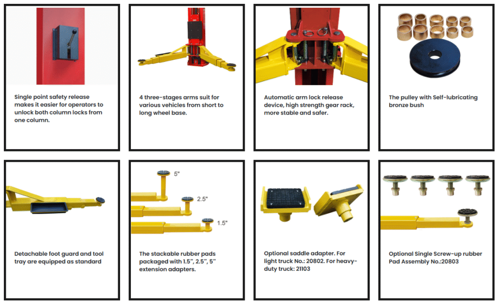 - 4 three-stage arm design allows to lift vehicles from short to long wheel base