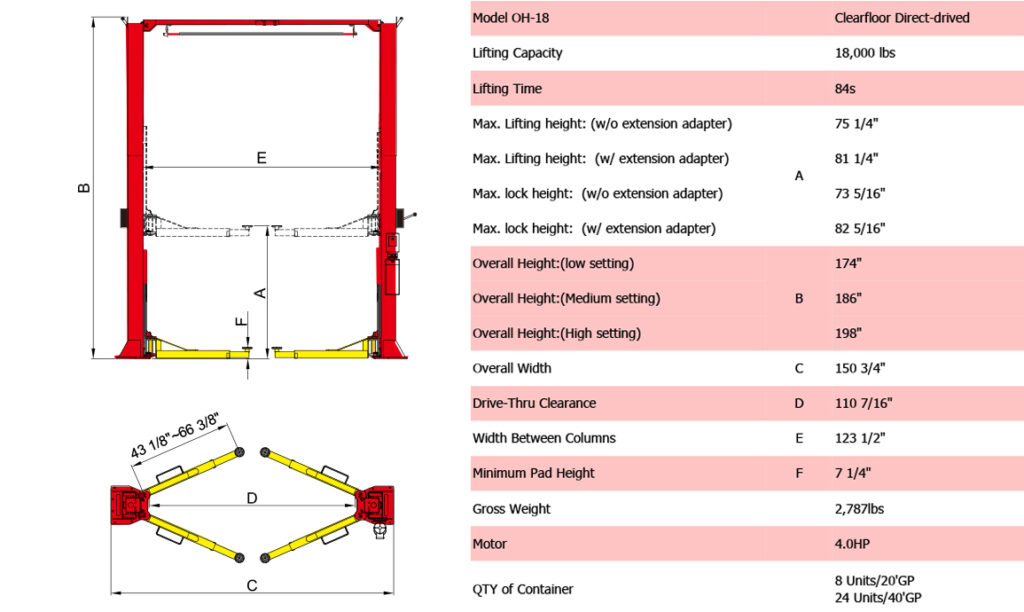 AMGO’s latest OH-18 boasts heavy-duty construction, offering immense lifting capacity up to 18000lbs. It features long, sturdy carriages for enhanced stability and is equipped with two types of rubber pads to suit various vehicles. Moreover, it incorporates AMGO’s 3 in 1 technology for effortless height setting.
