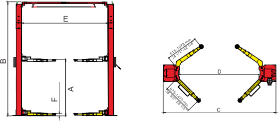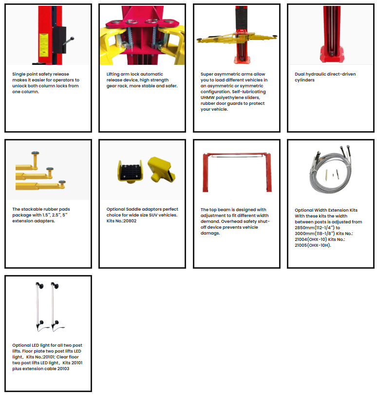 The OHX-10H is the extremely high lifting model with lifting height up to 78 3/4″ ~ 87 3/4″. Height & Width adjustment. The lift is designed with super asymmetric arms and share many same features as model OHX-10.